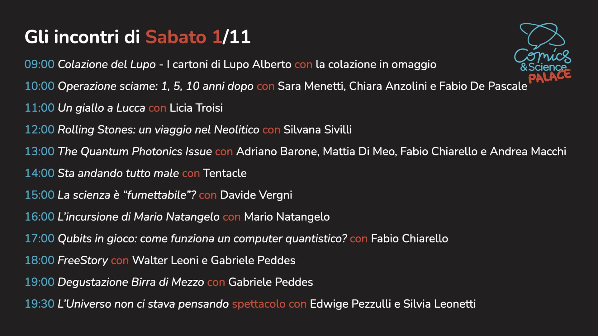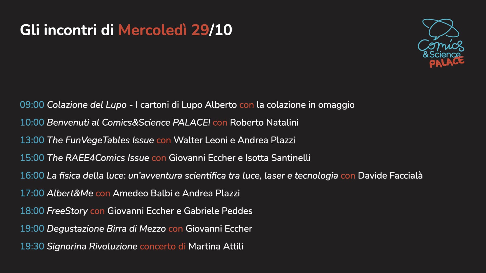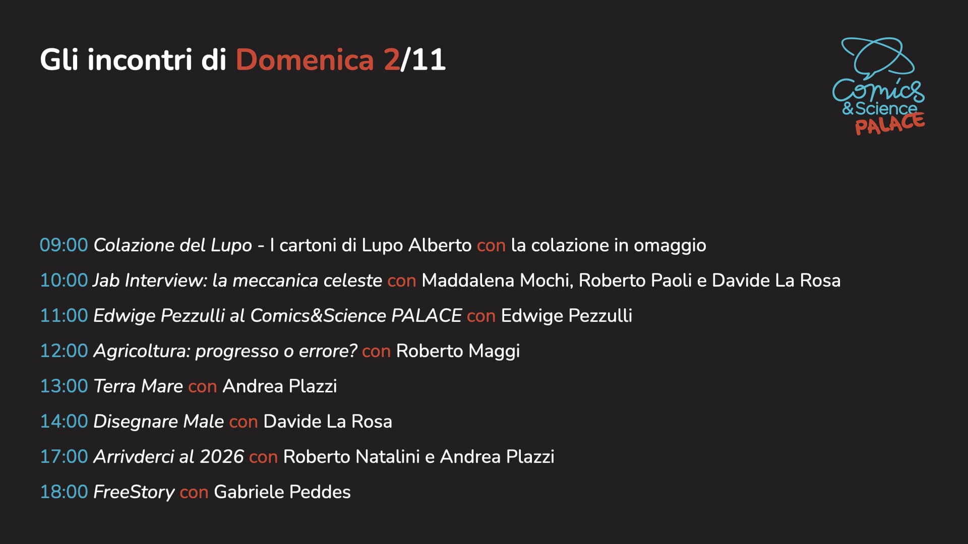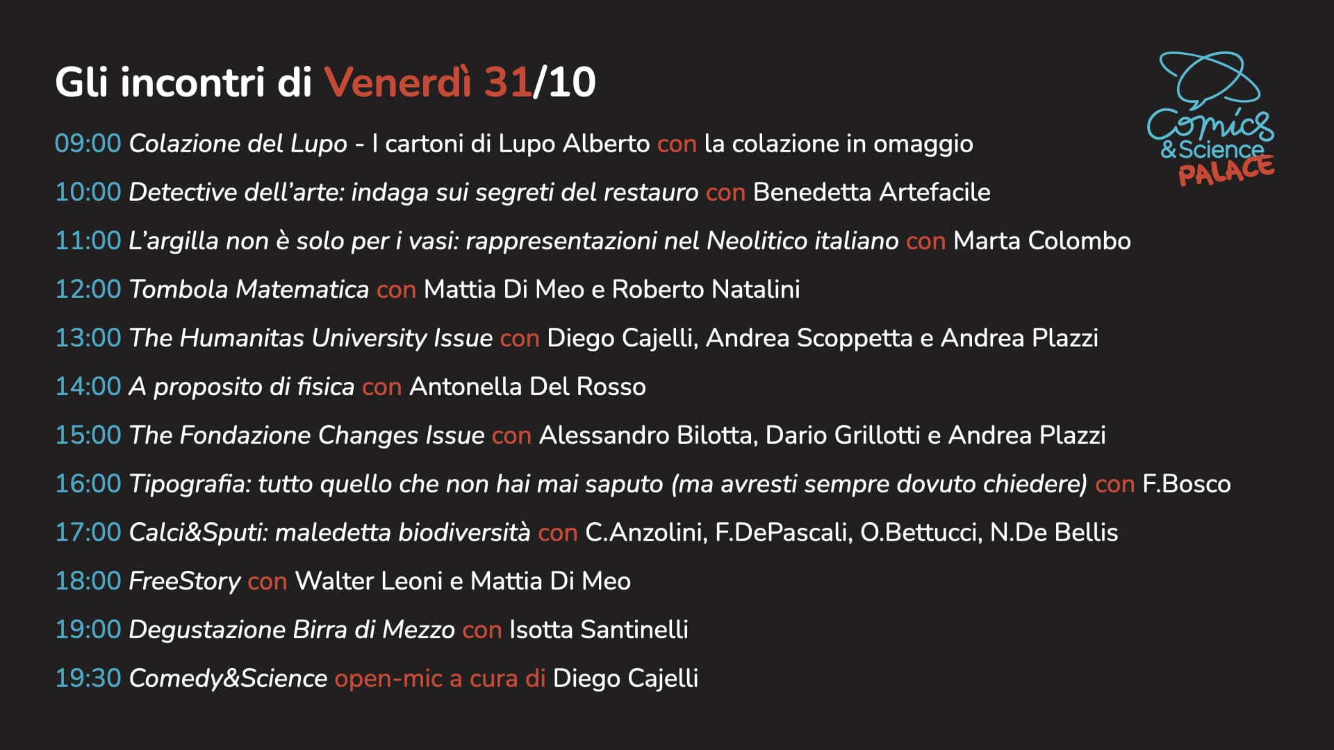 A grande richiesta torna Comedy&Science, l’appuntamento che unisce divulgazione, risate e intrattenimento in una formula inedita e travolgente. Sul palco del Comics&Science PALACE va in scena una serata di stand-up comedy e open mic, condotta dal poliedrico sceneggiatore Diego Cajelli, che per l’occasione vestirà i panni di un vero e proprio “domatore di comici”. Con la sua ironia e il suo talento di narratore guiderà il pubblico attraverso una giostra di battute, monologhi e osservazioni taglienti, dando spazio a voci diverse e a stili comici capaci di sorprendere e coinvolgere.