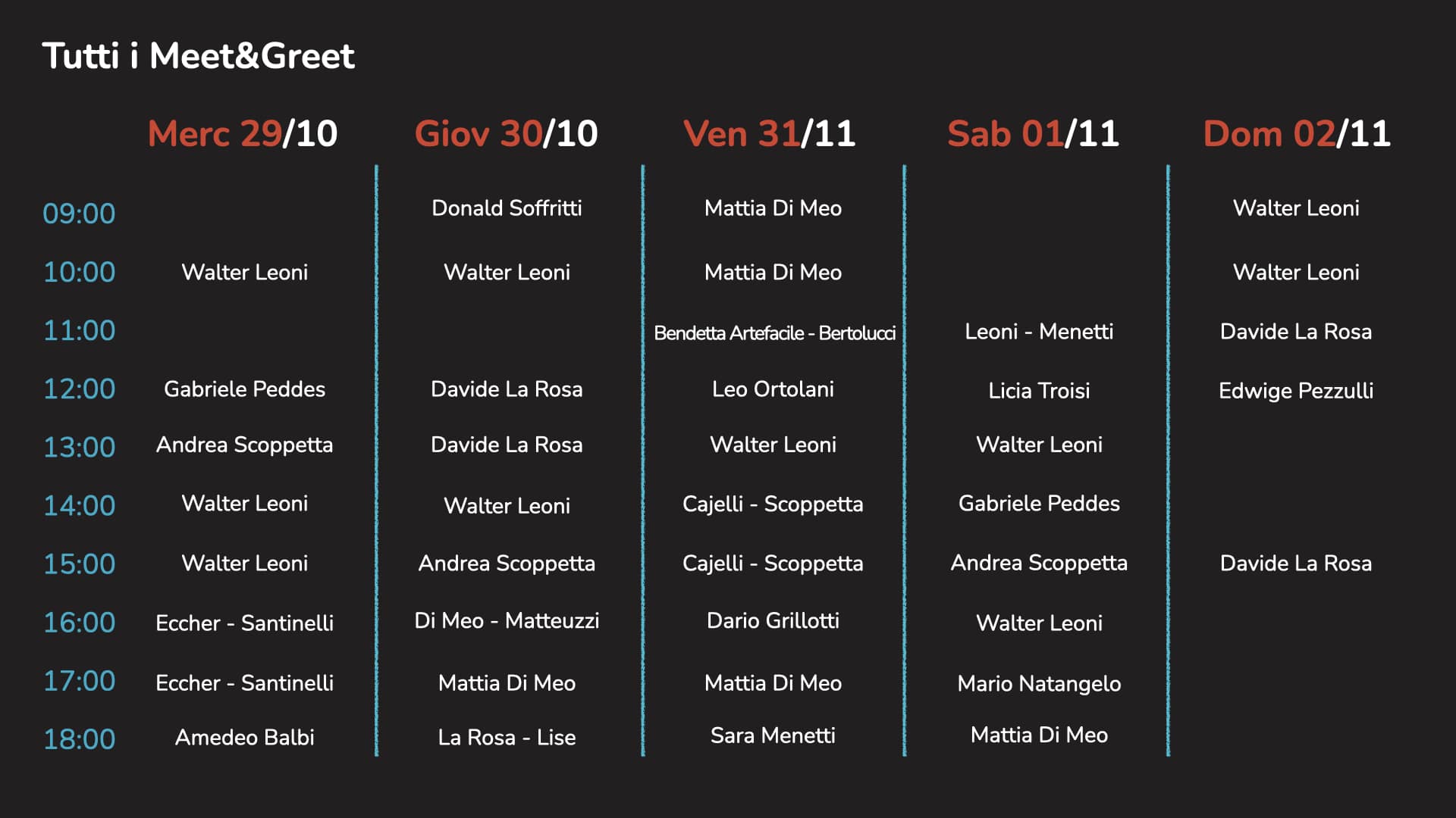 • Area Meet&Greet, per incontrare autori, artisti e ricercatori, scambiare due parole, farsi firmare un albo o scattare una foto ricordo.
