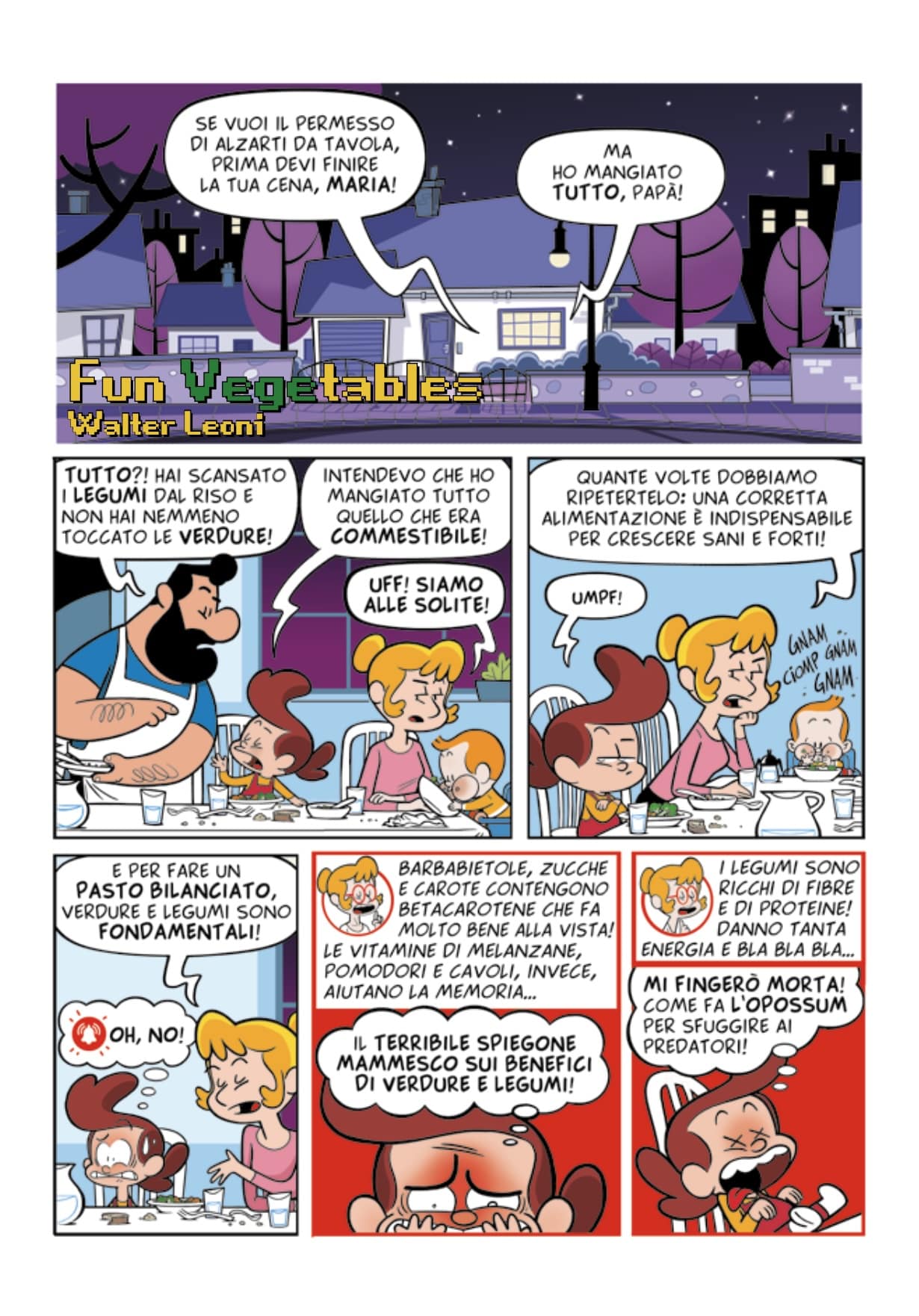 Il fumetto The FunVegeTables Issue porta questo messaggio in una forma originale e coinvolgente. Walter Leoni – un veterano del progetto Comics&Science – dà vita a un cast di personaggi vegetali che diventano eroi capaci di affascinare e intrattenere i lettori più giovani, trasformando un tema complesso come la nutrizione in una narrazione divertente e accessibile.